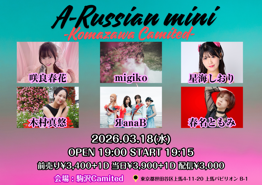 A-Russian mini #えーらしあん 日程: 3月18日(水) 会場: 駒沢Camited OPEN 19:00 / START 19:15 前売り¥3,400 当日¥3,900 各+1D 配信¥3,000 【来場】2月17日 21:00予約開始 https://tiget.net/events/467772 【配信】 https://premier.twitcasting.tv/kmzw_camited/shopcart/420646